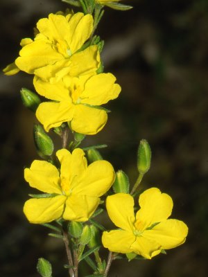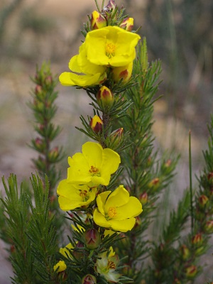 Local Guinea Flowers are prostrate to small shrubs. They have bright yellow flowers with 5 petals.